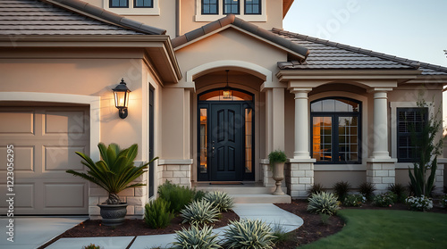 Luxury Home Exterior: Modern Architecture and Landscaping Design. A stunning showcase of residential property with elegant entrance, garden, and walkway.