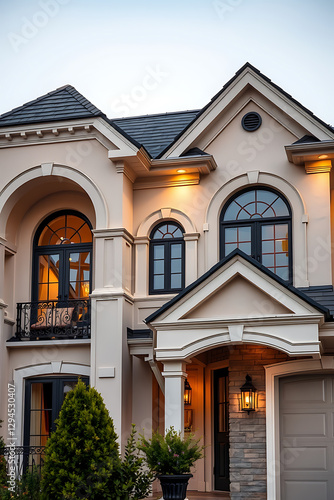 house, home, architecture, building, exterior, luxury, residential, property, design, facades, window, evening, night, lighting, elegant, modern, classic, style, balcony, door, entrance, roof, landscaping