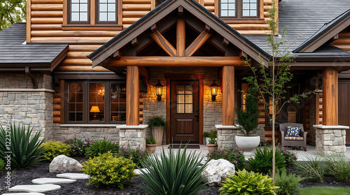 Luxury Log Cabin Home with Stone Exterior and Landscaped Entrance. A perfect blend of rustic charm and modern design, this stunning property offers breathtaking views and a cozy atmosphere.