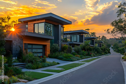 Luxury Modern Homes at Sunset in a Landscaped Community
