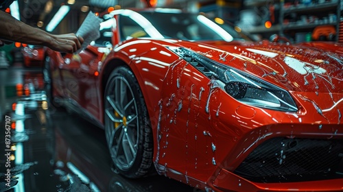 car, luxury, red, sport, laundered, detailing, modern, shop, water, droplet, reflections, sleek, automotive, care, product, advertisement, industry, article, service, marketing, meticulous, clean, shine, professional, dynamic, realism, sophistication, designer