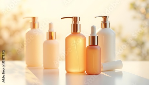 Luxury skincare bottles, golden serum, beauty product
