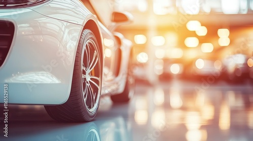 sport, car, luxury, tire, wheel, rim, automobile, vehicle, garage, interior, transportation, showroom, automotive, dealership, new, speed, engine, power, sleek, modern, blur, bokeh, sunlight, background, copy, space, design, elegant, wealth, asphalt, grey, white, black, chrome
