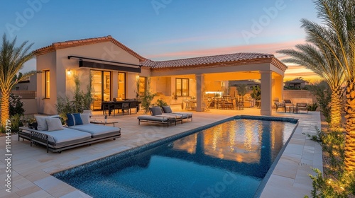 house, villa, home, residence, pool, swimming, patio, luxury, modern, architecture, evening, sunset, twilight, landscape, backyard, garden, palm, tree, furniture, lounger, chair, table, light, illumination, relaxation, calmness, resort, vacation, mediterranean, spanish, style, elegance, comfort, roomy, open, sky, night, calm, serene, beautiful, dream, paradise, oasis, estate, property, real, exterior