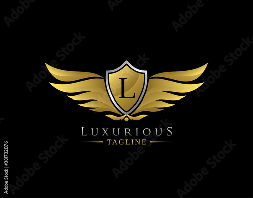 Luxury Wings Logo With L Letter. Elegant Gold Shield badge design for Royalty, Letter Stamp, Boutique, Hotel, Heraldic, Jewelry, Automotive.