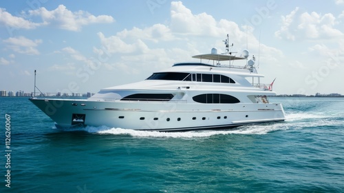Luxury Yacht Cruise: A sleek, white luxury yacht glides effortlessly across the turquoise waters, under a vibrant blue sky dotted with fluffy white clouds. The scene exudes opulence and tranquility.