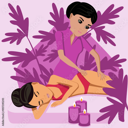 Lymphatic massage. Therapy and treatment by professional therapist in SPA. Isolated flat vector illustration. Indian and Eastern ethnicity.