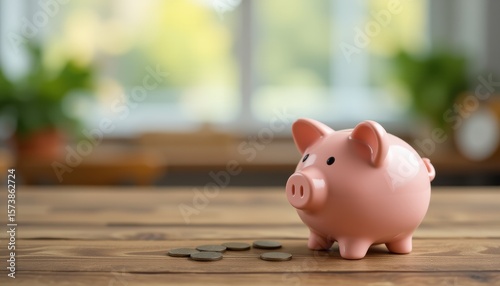 money, saving, baby pig, bank, wooden, surface, studio, light, sunny, lemon, tone, ai, generative