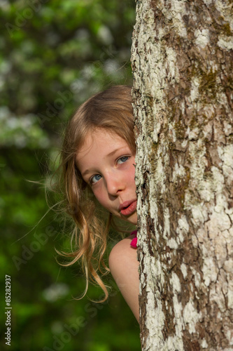 girl, blond, long hair, hair, children, schoolchild, laugh, tree, log, holding, merry, fun, pretty, young, lovely, summer, look, look, childhood, small, pretty, play, outside, nature, spring, natural