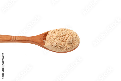 Maca gelatinized flour. Maca Powder in wooden spoon isolated on white, close-up. Peruvian superfood, natural organic supplement