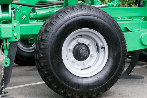 agricultural, machine, part, background, industrial, technology, wheel, rubber, steel, green, outdoors, nobody, horizontal