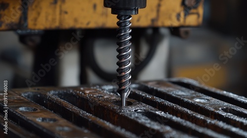 Machine drilling into cylindrical steel rod with metal curls and sharp textures