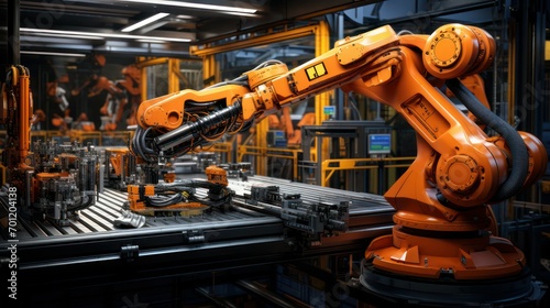 Machine robotic arm, High-tech assembly line in an automated industrial factory.