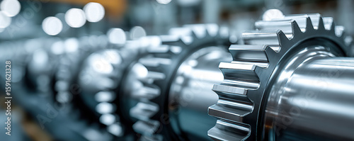 Machined gears aligned on production line highlighting precision engineering in manufacturing facility