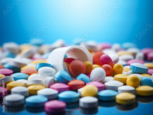 stethoscope, pill, bowl, blue background, macro, closeup, image, illustration, bg, background, concept