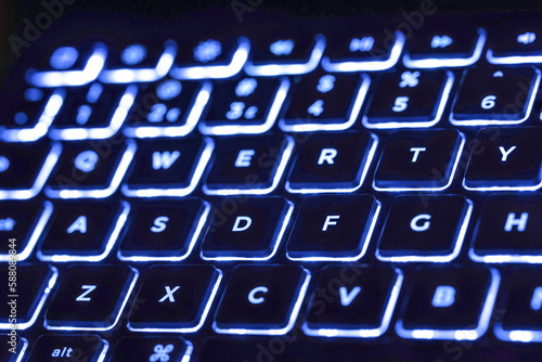 Macro closeup of electronic LED back lit keyboard, blue and white lighting