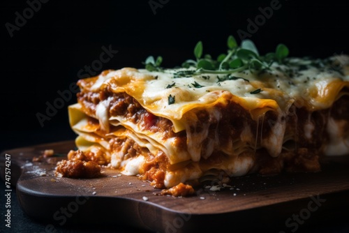 Macro detail close-up photography of a refined lasagna on a wooden board against a denim fabric background. AI Generation