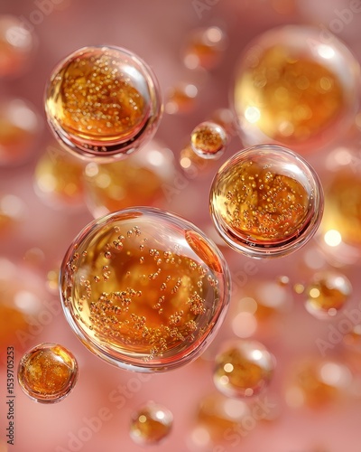 Macro illustration of transparent skincare droplets with golden oil cores on soft peach background, featuring hydration, purity, clarity, luminous glow, minimal design and elegant cosmetic concept