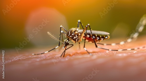 Macro of a tiger mosquito sitting on human skin and drinking blood