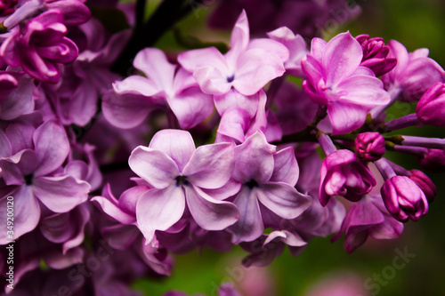 Macro of lilac, purple colorful flower. Lilac branch flowers macro and close-up. Purple and violet flower heads. Nature and flowers.