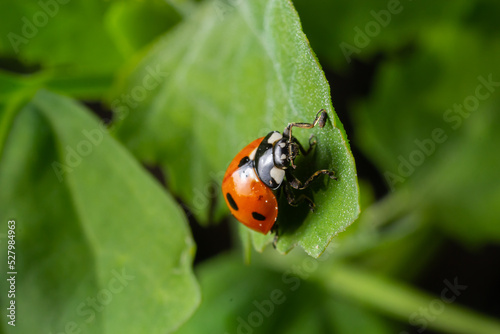 Macro of spring red ladybug Coccinella septempunctata on green leaf in forest, natural environment