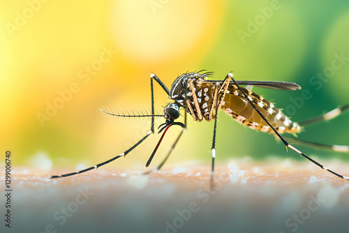 Macro photo of an Aedes mosquito biting human skin with a soft bokeh background