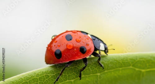 Macro photograph of a red ladybug with black spots covered in water droplets resting on a vibrant green leaf