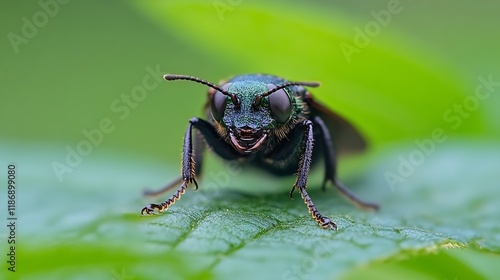 Macro Photography of a Vibrant Insect on Leaf Against Green Background : Generative AI