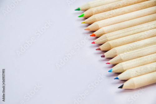 Macro photography of colorful pencils on the right side with copy space for text on left side. Back to school concept with multicolored crayons. Wallpaper with stationery light lavender background.