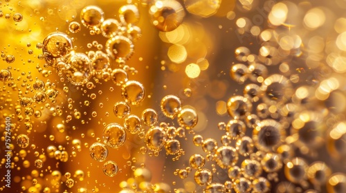 Macro shot of effervescent bubbles in sparkling champagne, reflecting the light in a festive toast