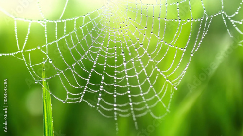 Macro shot of natural, delicate spider web adorned with dew drops glistens in morning light, surrounded by lush green grass, creating serene and tranquil natural scene