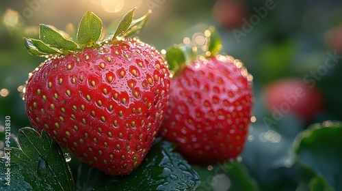 macro shot of plump glistening strawberries vibrant red hues intricate seed patterns water droplets catching light fresh green leaves