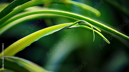 Macro shot of spider plant leaf tip, indirect light, sharp focus, detailed edge, vibrant green.