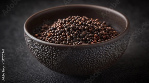 Madagascan Voatsiperifery Wild Pepper a dark ceramic bowl moody low key lighting emphasizing deep earthy hues and wrinkled textures single light source creating dramatic contrast
