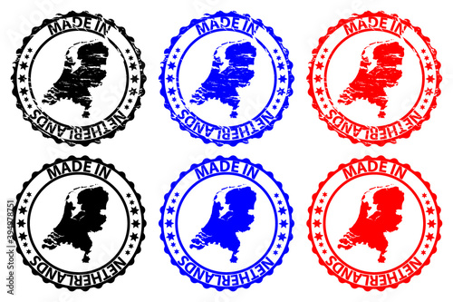 Made in Netherlands - rubber stamp - vector, Netherlands map pattern - black, blue and red