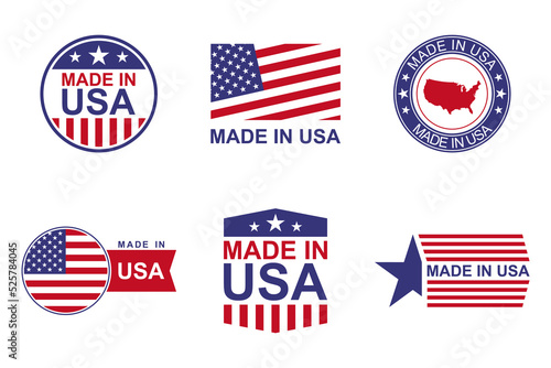 Made in USA labels set. Product manufactured in the United States of America icon patriotic signs. American quality business and national theme. Americans banners templates. Vector illustration