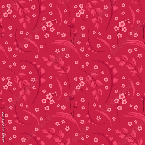 Magenta Floral Seamless Pattern. Blooming Flowers, Red and Pink Leaves and Hearts. Vector Digital Wallpaper. Scrapbook Paper on Red Background