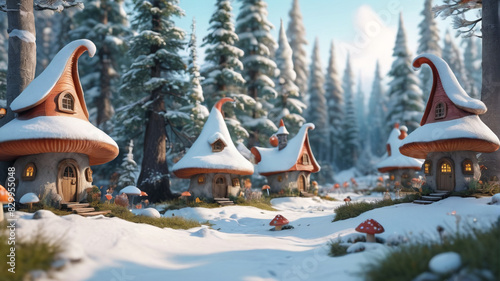 Magic gnome village with snow in a winter forest. Features cute fairy tale mushroom houses for an elf panorama background. Generative AI.