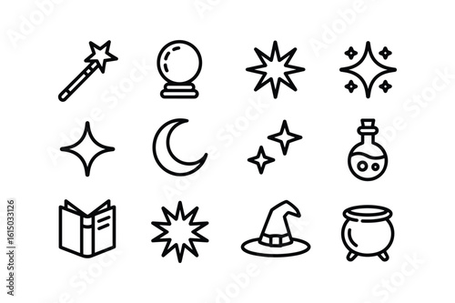 magic wand, crystal ball, starburst, sparkle, crescent moon, open book, cauldron, fantasy, mystical, enchantment, witchcraft, occult, symbol, icon, line art, black-and-white, illustration, graphic design, creative, imaginative, whimsical, mysterious, magical, enchanting, bewitching, supernatural, alchemy, divination, cognition, celebration, halloween, folklore, mythology, ancient, traditional, decorative, simple, clean, modern