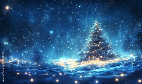 Magical Christmas night scene with a glowing Christmas tree in a snowy forest. Sparkling lights and falling snow in a dark blue winter wonderland.