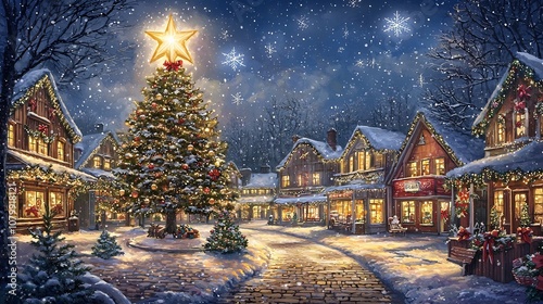 Magical Christmas Star Atop Festive Village Scene in Winter Wonderland