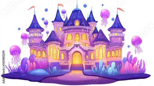castle, fantasy, magical, fairy tale, architecture, bright, colourful, jellyfish, ocean, sea, environment, landscape, whimsical, structure, blue, purple, night, plant, art, design, window, light, pathway, surreal, marine life, nature, decoration, creativity, adventure, children, imaginative, mystical, home, fortress, scenery, illustration, storytelling, attraction, character, vibrant, atmosphere, dreamy, detail, enchanting, uniqueness