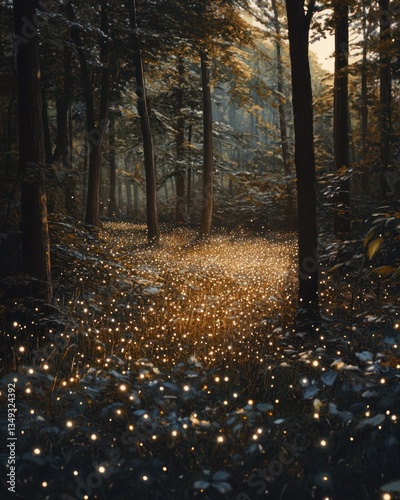Magical forest path, glowing fireflies, evening light, serene nature scene, fantasy backdrop