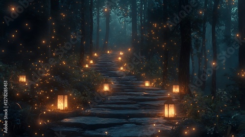 Magical forest path, lanterns, fireflies