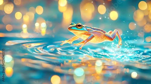 frog, amphibian, water, bokeh, light, golden hour, magic, fantasy, surreal, dreamlike, mystical, vibrant, colourful, teal, turquoise, gold, sparkle, splash, ripple, texture, background, wallpaper, illustration, digital artwork, nature, animal, wildlife, aquatic, peaceful, serenity, beauty, art, design, graphic, image