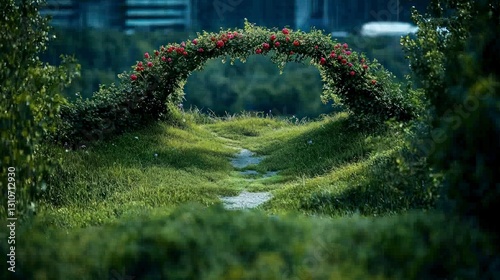 Magical Rose Archway Garden Path Lush Greenery Vibrant Flowers Secret Garden