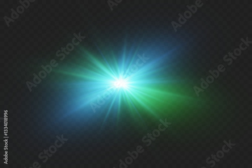 Magical special effect of flash, light star, explosion of rays and lens.