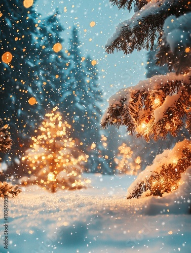 christmas, winter, snow, snowfall, christmas tree, light, snowy, branch, holiday, festive, magic, sparkle, glistering, illuminated, bright, cosy, serene, peaceful, nature, forest, tree, evergreen, cold, frost, season, celebration, background, winter landscape, bokeh, fairy, night