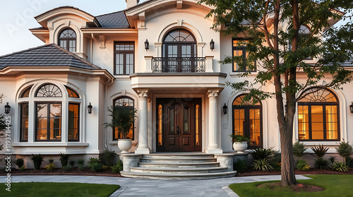 house, home, architecture, building, exterior, luxury, luxury home, residence, property, classic, elegant, grand, residential, estate, column, window, door, balcony, facades, stone, brick, design, style, modern, contemporary, traditional, entrance, pathway, landscaping, garden, night, evening, dusk, lighting, warm, inviting, beautiful, impressive, magnificent, stunning, gorgeous, high-end