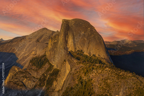 Magnificent Half Dome mountain in Yosemite National Park, California, under a glowing orange sunset sky, showcasing dramatic granite cliffs and breathtaking wilderness landscape for travel concepts.